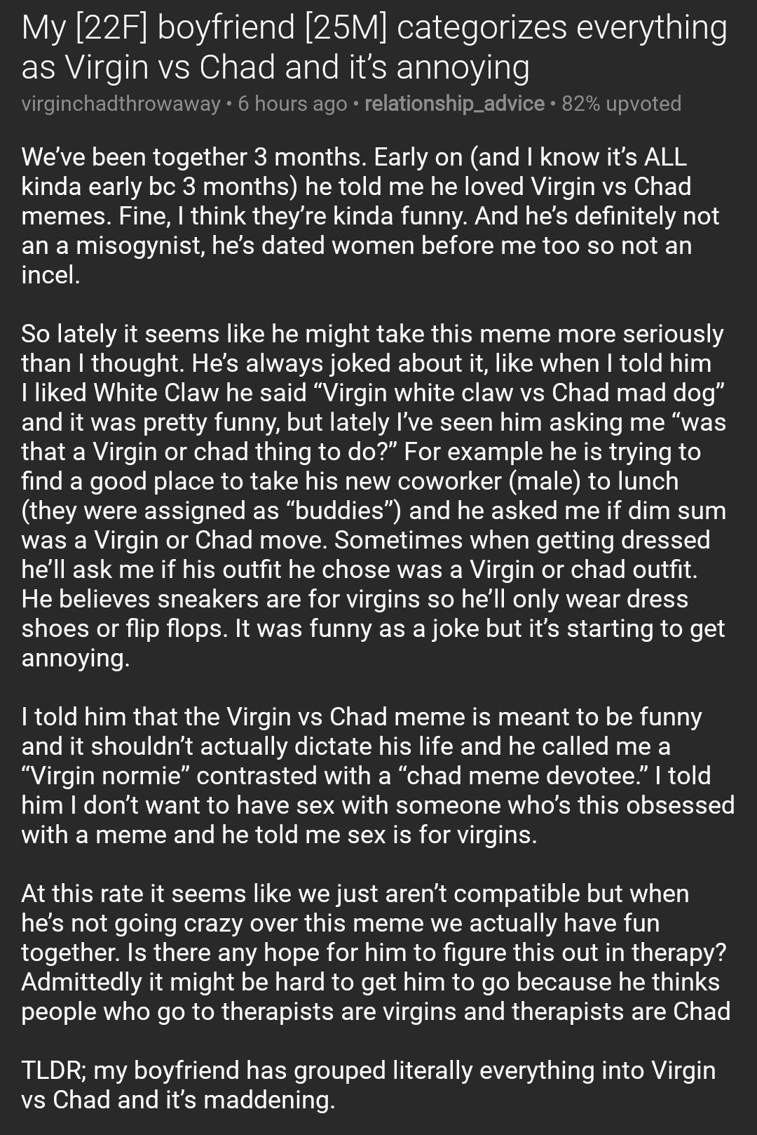 Incel the online community of involuntarily celibate men radicalized by their shared mistrust of women has existed on the internet for years. Tisa 19092 748 days ago. Caption a meme or image make a gif make a chart make a demotivational flip through images. Yes we spend our time on our computers making original memes it gets stolen and posted on reddit where chad sees it and let s out a light chuckle even though he doesn t understand it. 30 normie and 30 chad this message is submitted by a bot. Featured normie vs yes chad memes. High quality chad memes gifts and merchandise.